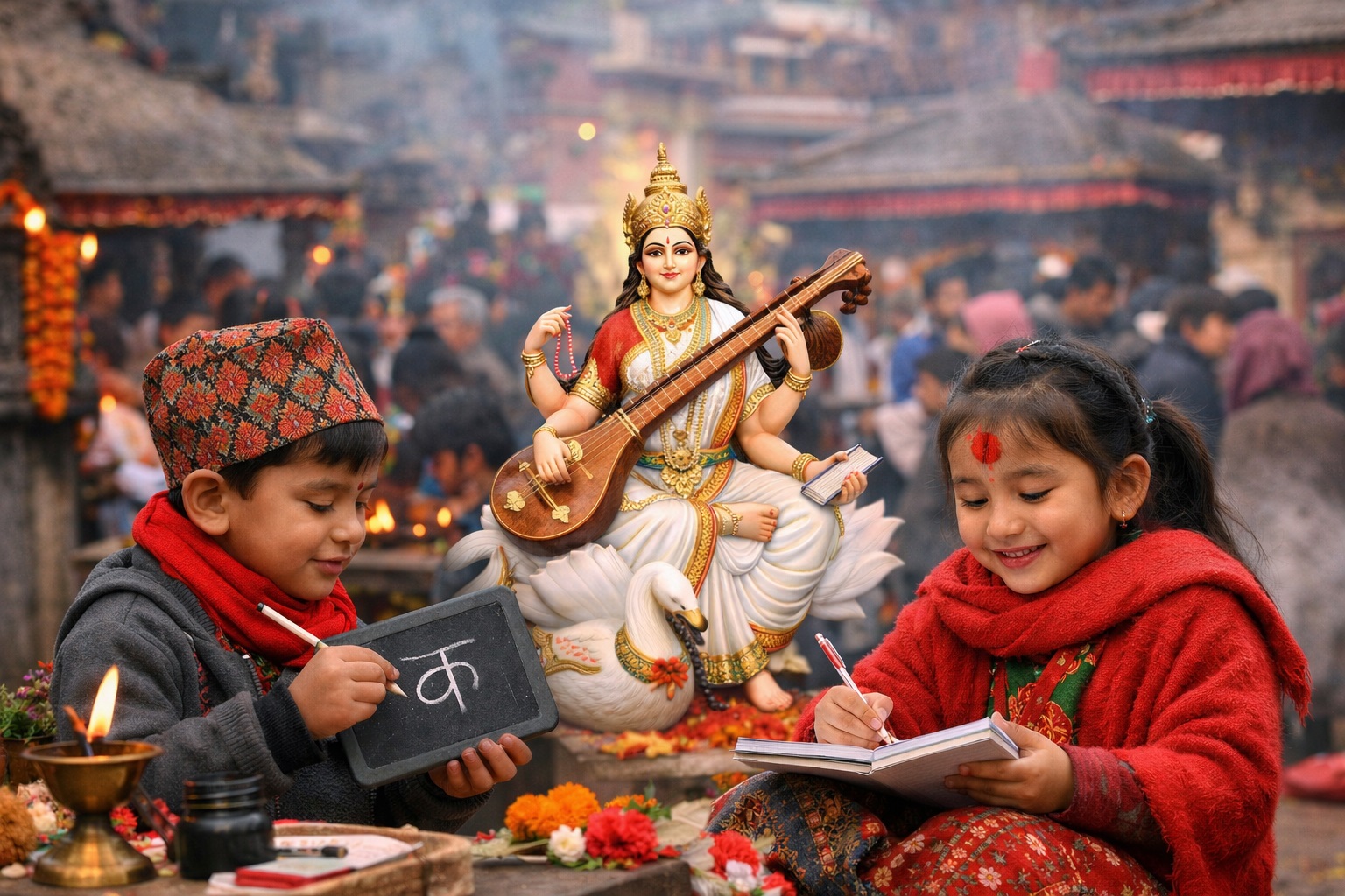 काठमाडौं उपत्यकाका स्वयम्भू, मैतीदेवी, नीलसरस्वती, हनुमानढोका तथा ललितपुरको लेले लगायत देशका विभिन्न स्थानस्थित सरस्वती मन्दिरमा आज विशेष पूजा–आराधना भइरहेको छ। कतिपय भक्तजनले सरस्वतीलाई चढाइएको सात गेडा अक्षता निले विद्या बढ्ने विश्वास समेत राख्ने गरेका छन्।